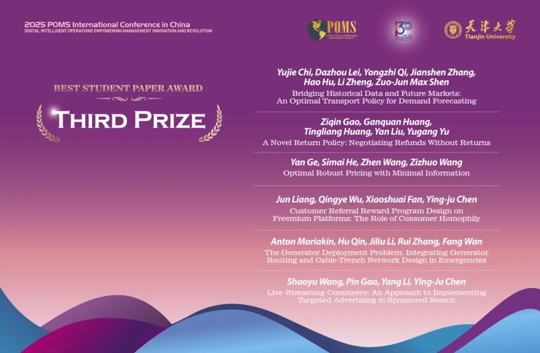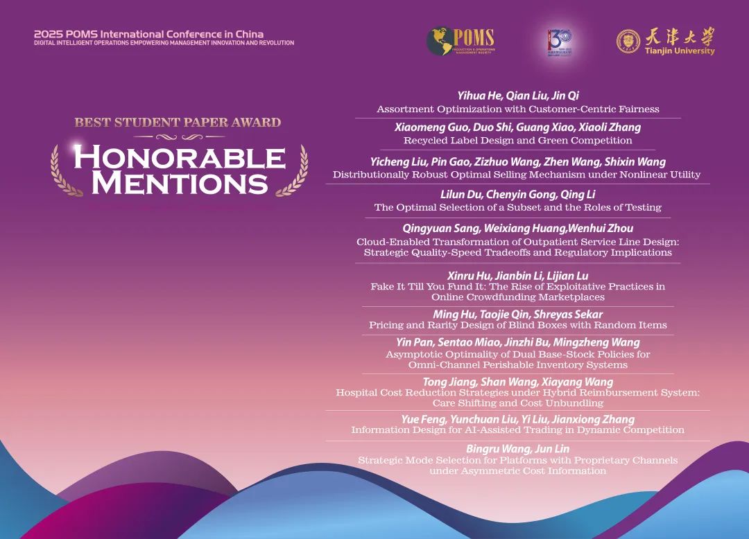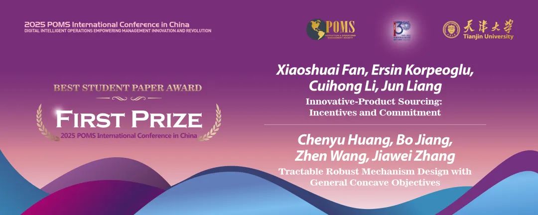 为鼓励青年学者们开拓创新,推动学术理论发展突破,7月12日晚,举办POMS最佳学生论文颁奖仪式,经过POMS最佳学生论文评审委员会严格评审,最终评选出一等奖2篇、二等奖2篇、三等奖6篇、提名奖11篇,并在会上对获奖青年学者予以颁奖(获奖名单见文末)。