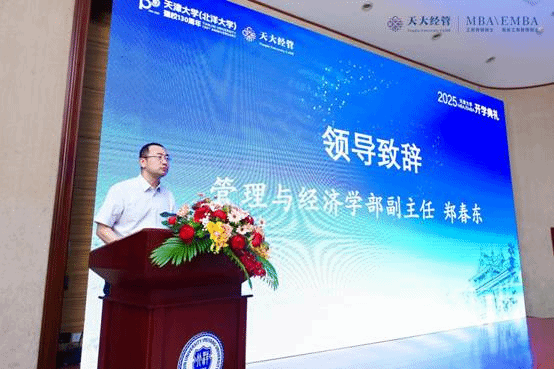 第二十四届MBA联合会执行主席何世亮作为在校生代表发言。他结合自己在天大MBA项目中的学习与成长经历,分享了如何在课程学习、实践锻炼与校园文化中实现自我突破的宝贵经验。并鼓励新同学们积极融入校园生活,主动参与各类活动,拓展视野、提升领导力,为未来的职业发展奠定坚实基础。他的话语真挚而有力,为新同学们注入了前行的勇气与信心。