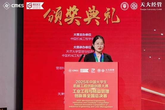 西北工业大学王婷代表获奖选手发表获奖感言。她对大赛执委会、各位评委和指导老师表达由衷的感谢。她表示,大赛为参赛师生提供了广阔的学习交流平台,在参赛过程中深刻体会到了工业工程的价值,提升了跨专业协作与系统思维能力,更坚定了投身国家高端制造与航空强国事业的信念。