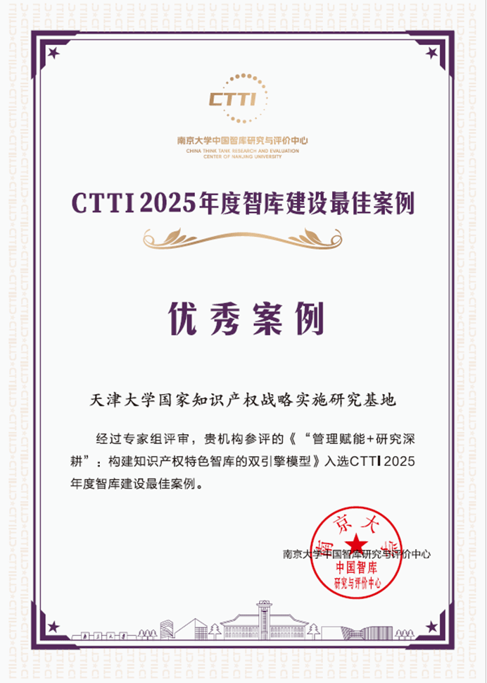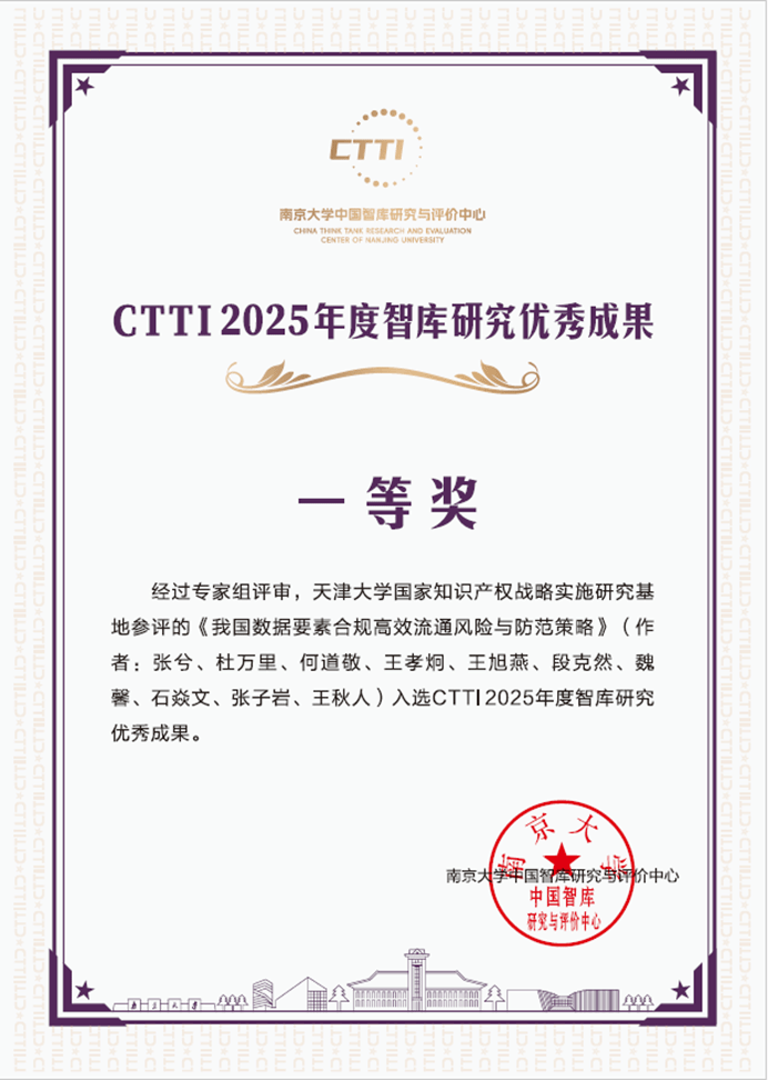 在智库最佳案例与优秀成果方面,研究基地同样表现不俗,张俊艳教授团队申报的《我国企业海外知识产权维权支持政策研究》和张兮教授团队申报的《我国数据要素合规高效流通风险与防范策略》均入选CTTI 2025年度智库研究优秀成果一等奖,研究基地办公室申报的《“管理赋能+研究深耕”:构建知识产权特色智库的双引擎模型》入选CTTI 2025年度智库建设最佳案例。