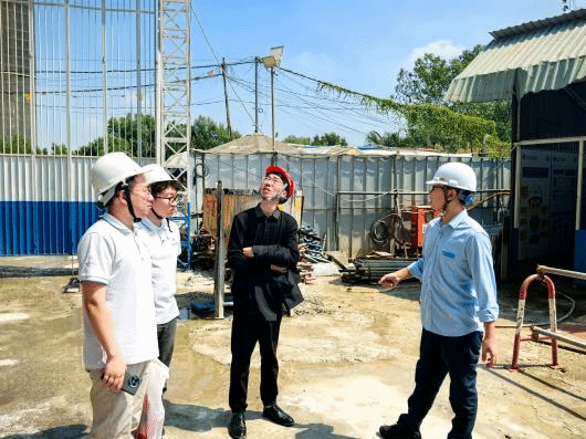 随后,实践队抵达中建二局越南H14-3项目部进行实地调研。该项目位于胡志明市第七郡高档核心区域,是一座集现代化与生态化于一体的高端房建工程。项目代表围绕属地化运营管理、绿色建造实施路径等内容进行了系统介绍与经验分享。