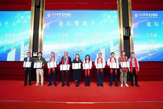 天津联商创新发展促进会会长、天津津东嘉诚集团董事长付敏英作为特邀嘉宾致辞。她代表联商促进会对论坛的顺利举办表示热烈祝贺,并高度赞赏天大EMBA育人成果与校友担当,随后介绍了促进会跨商学院融合、公益服务的平台理念,期待与天大EMBA深化合作、聚力融通,共同助力天津高质量发展。
