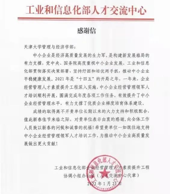 2022年初,acg盒子 收到工业和信息化部人才交流中心的感谢信,以感谢我学部2021年度在《国家中长期人才发展规划纲要》部署的“企业经营管理人才素质提升工程”中小企业经营管理领军人才培训项目中所做的工作,这既是一份荣誉,也是沉甸甸的责任。