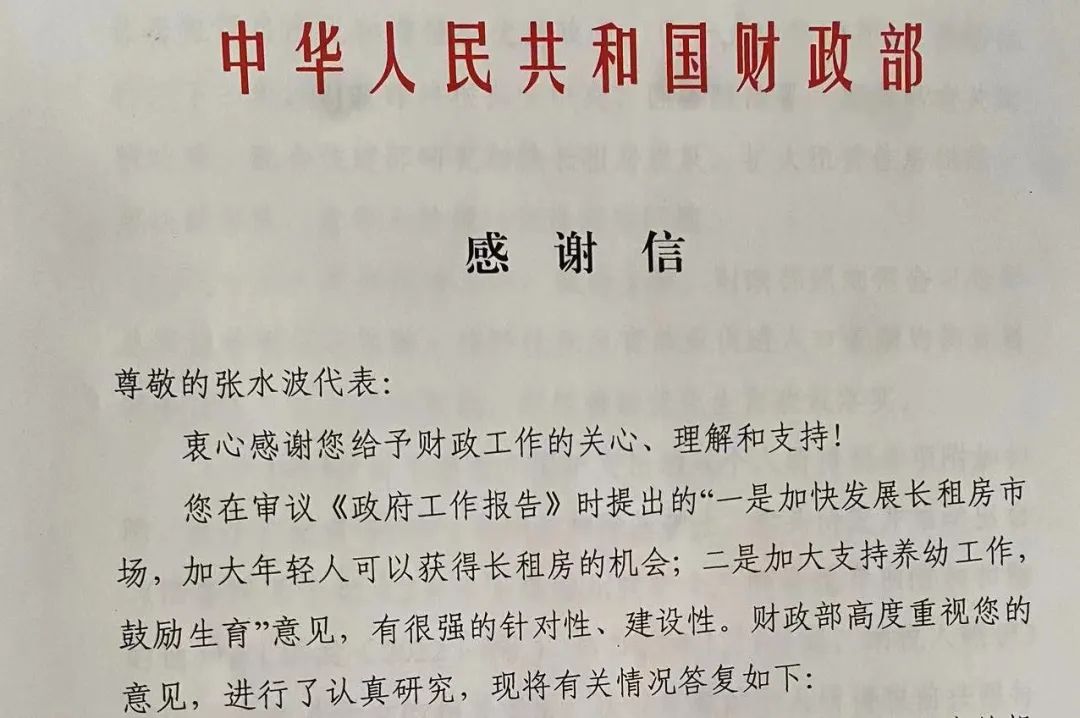 张水波代表收到财政部发来的感谢信