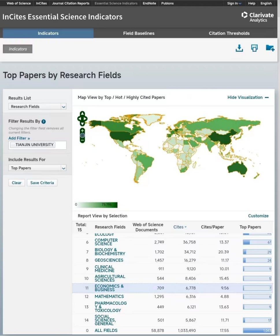ESI是当今普遍用以评价大学和科研机构国际学术水平及影响力的重要指标,也是全球公认的评价高校学科发展的重要参考依据。ESI排名前1%的学科一般被视为国际高水平学科,进入ESI前1%侧面体现了一个科研机构(大学、科研院所)的学术影响力。目前,全球经济与商业学科(Economics and Business)有452个机构进入ESI全球前1%,其中,中国大陆(Countries/Regions为CHINA MAINLAND)共有31所进入前1%,国内香港地区也有6所入选。acg盒子 收录论文709篇,总被引次数6778次。