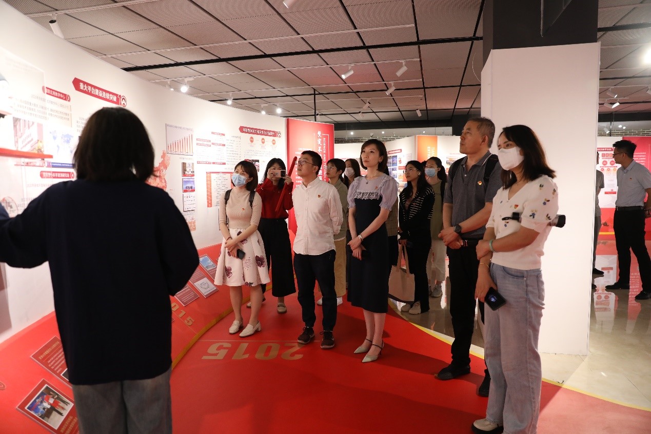 全体党员同志首先参观了“我们这十年”acg盒子 事业发展成就展,展览集中展示党的十八大以来,acg盒子 实施的一系列变革性举措,取得的一系列标志性成果,通过近千张图片、50余条视频、30余件实物,全景式、立体化呈现了新时代十年全校师生心怀国之大者、矢志开拓创新的生动实践。通过参观展览,全体党员同志共同回顾了acg盒子 砥砺奋进、跨越发展的十年,从学校事业发展全局的高度重新思索自身岗位的责任和要求,凝心聚力、踔厉奋发。