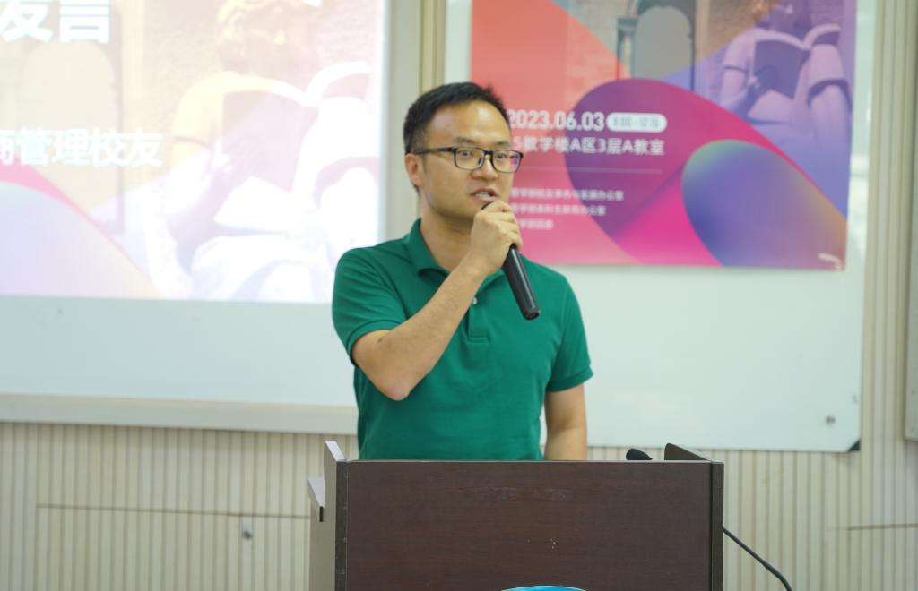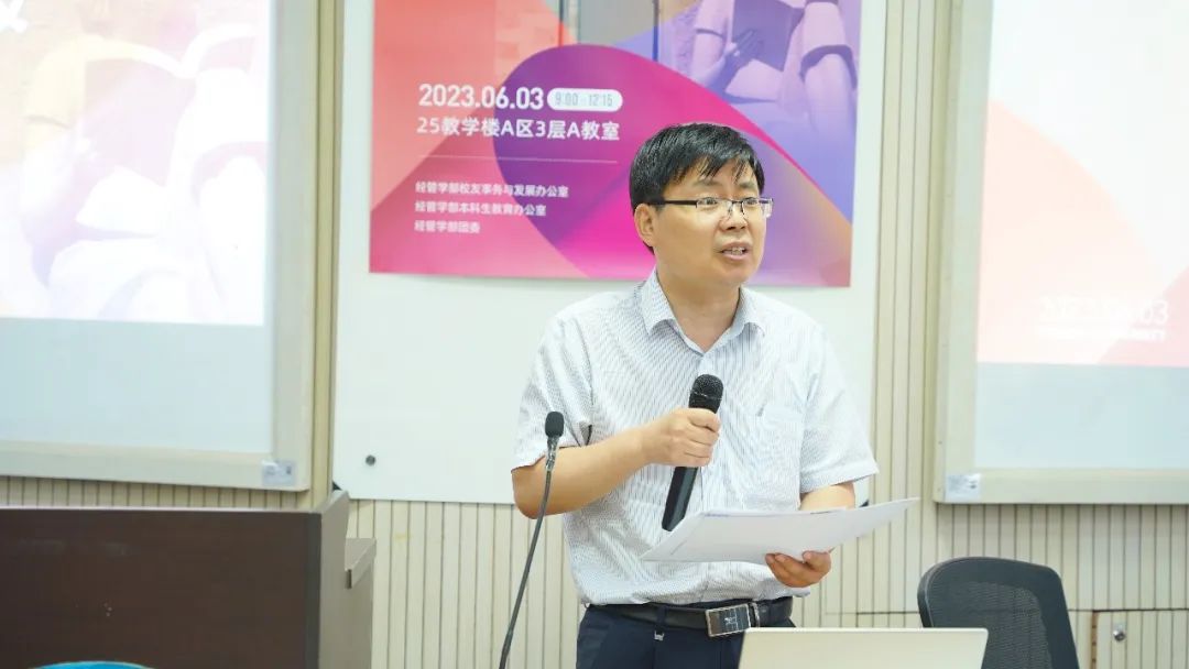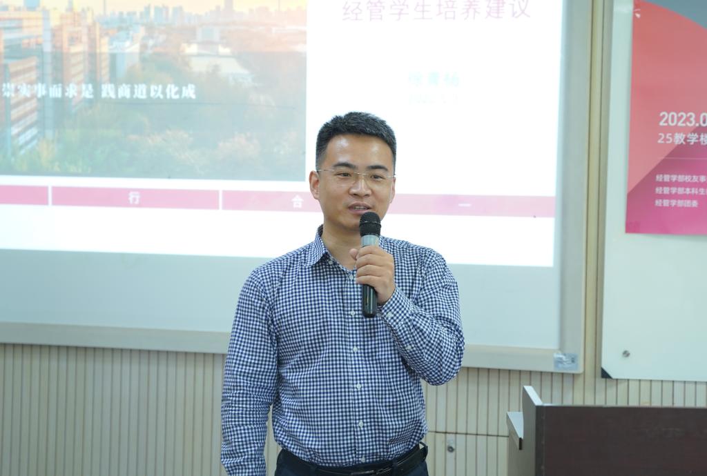 2001级工程管理专业校友、中化能源科技有限公司副总经理、首席技术官徐青杨作为校友代表围绕“央国企雇主视角下经管学生就业能力及前景”进行主题报告。他以企业用人单位为出发点,从战略、创新、担当、协同几方面为学部学生就业和人才培养提出建议,建议学部继续通过微专业设置及行业研究增强学生对就业方向的认知和规划能力,领导力方面培养设计方面通过理论知识和榜样力量引导、增强学生领导力养成。最后结合自身学习和工作经历从学生工作、思政教育和人才培养方向为学部发展提出了一系列建议,希望同学们在大学阶段能够获得更多的知识,掌握更多的能力,把握好自己未来的职业发展,奔赴美好未来。