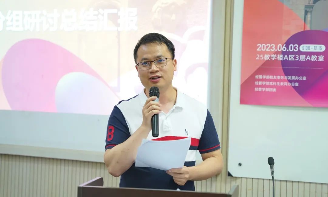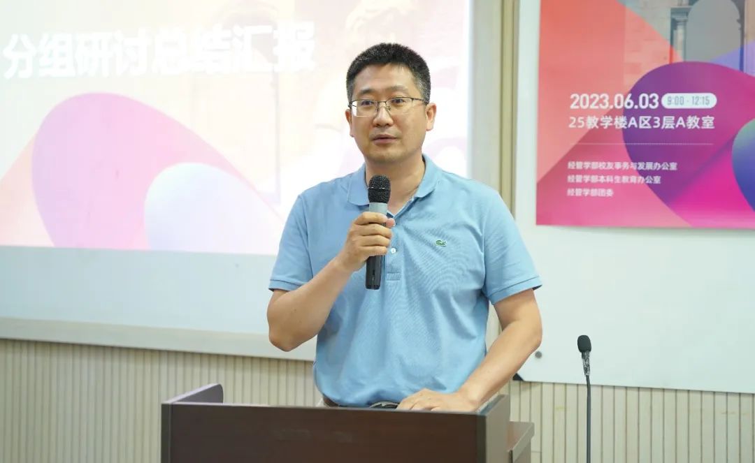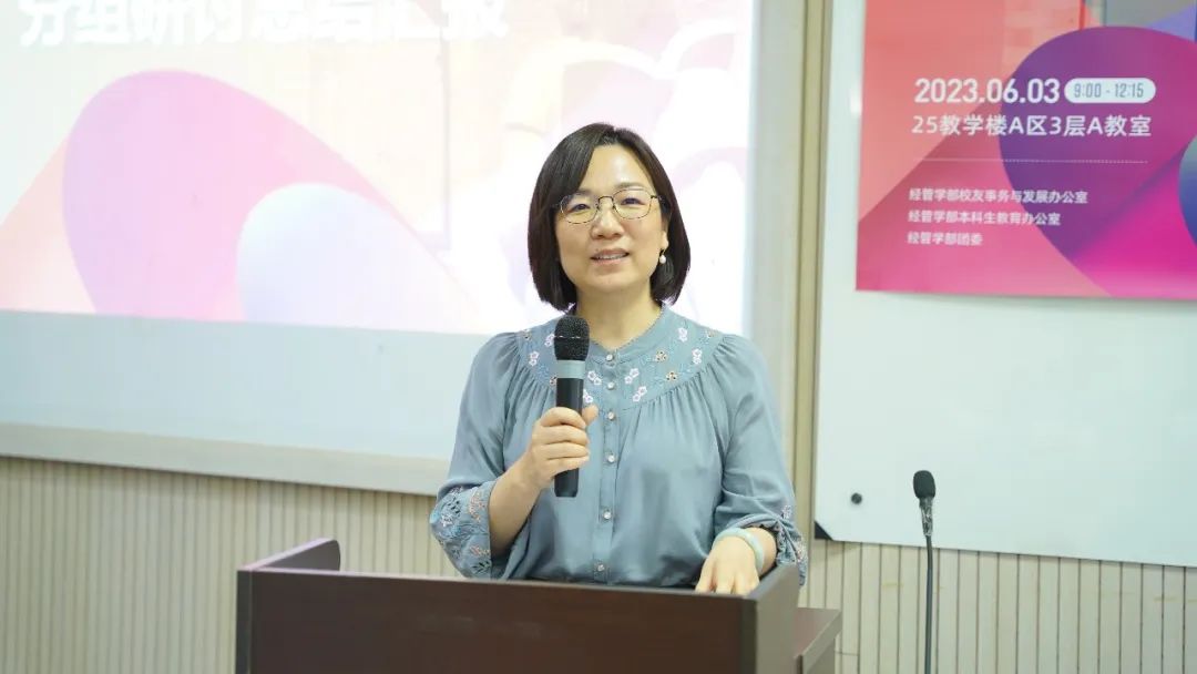 财务管理系主任李胜楠代表会计与财务管理、金融组做研讨汇报。该组提出:一是加强专业课深度;二是加强学生表达、沟通、写作能力的训练;三是增加真实场景下专业知识的学习和应用,如开设游学、模拟等实践学习环节,并针对如何与企业建立学生实习的长效合作机制提出了具体建议。