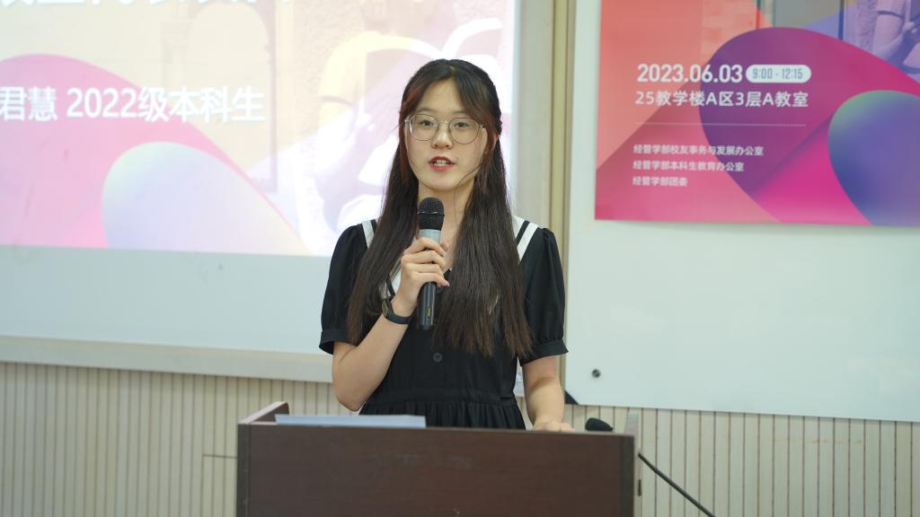 2022级本科生郑君慧作为新生代表分享获赠感言。她代表2022级经管学部全体大一新生向学部老师以及捐赠图书的校友们表达最诚挚的感谢,她从班级工作、课程学习和志愿服务等方面分享了自己在大一学年中所获得的收获和成长,并表示在未来的学习中将怀揣着满腔热情和追求卓越的信念,努力前行,为国家和社会发展贡献自己的力量。