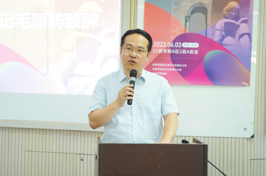毛照昉为本次活动致开幕辞。他代表学部全体师生向各位校友和参会师生表示热烈的欢迎和衷心的感谢,随后从人才培养、学科建设、科学研究等方面介绍了学部近年来取得的成绩。他提到,学部的发展离不开校友们的支持和帮助,本次高质量经管人才培养论坛暨校友奉书香捐赠仪式,邀请校友和同学们共同完成捐赠仪式,传递同窗之情,并请校友、老师和同学们齐聚一堂,就“高质量人才培养”这一主题开展研讨,共话创新,共谋发展,共赴未来。他指出,未来经管学部将继续秉持“打造与工科相融合,国际知名的管理与经济学科”的愿景,“崇实事而求是,践商道以化成”的使命,努力培养出卓越的“新商科”人才,希望老师、校友和同学们能够齐心协力,一同继续为经管学部的发展而努力。