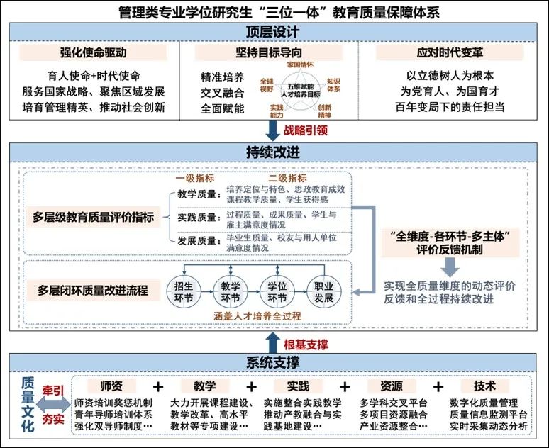 坚守为党育人、为国育才,提出“使命驱动-目标导向-应对变革”教育理念,凝练新时代管理类专业学位教育使命,形成“家国情怀-知识体系-创新精神-实践能力-全球视野”五维赋能人才培养目标,实现价值引领塑造。
