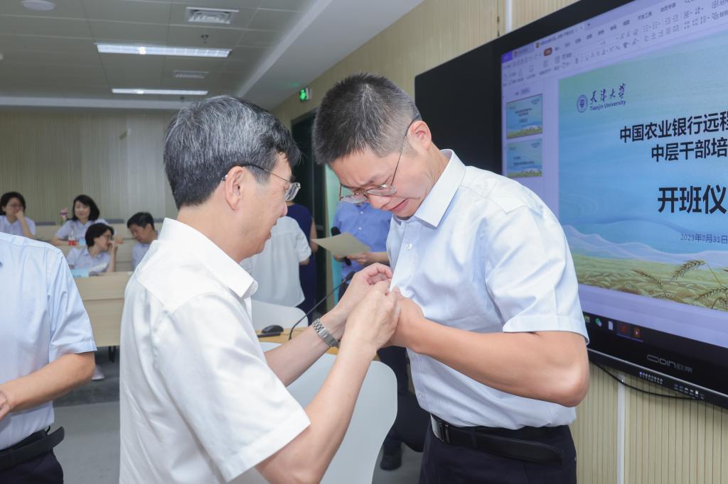 最后,刘晓国和杨欢为学员代表佩戴校徽,杨宝臣为学员代表授班旗。