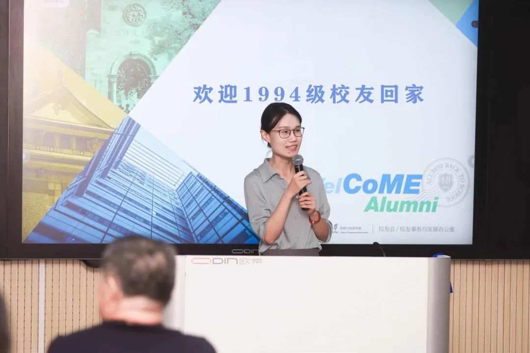 袁婷向大家作校友工作汇报。她表示,校友对于学校人才培养和产教融合等方面有着重要的作用,期待学部与校友携手并进,共同发展,期待大家常回家看看。