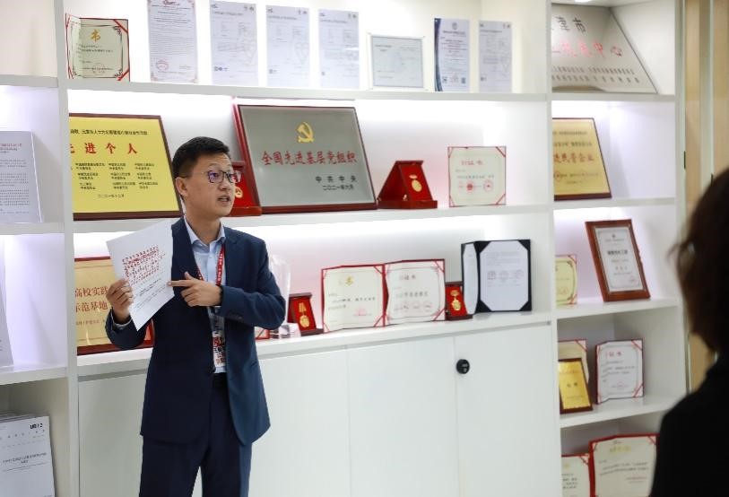 云账户(天津)共享经济信息咨询有限公司公共事务部专家分析师王春亨为老师们介绍了公司的业务开展情况和风控体系建设情况,带领老师们参观了公司的数字展厅、荣誉墙、办公室,介绍了公司“四快一慢”等提升工作效率的方式方法等。参观环节后,双方在会议室中进行了深入的座谈交流,进一步了解公司的党建引领实施情况,并就今后双方在学生实践、教育合作等方面进行了研讨。