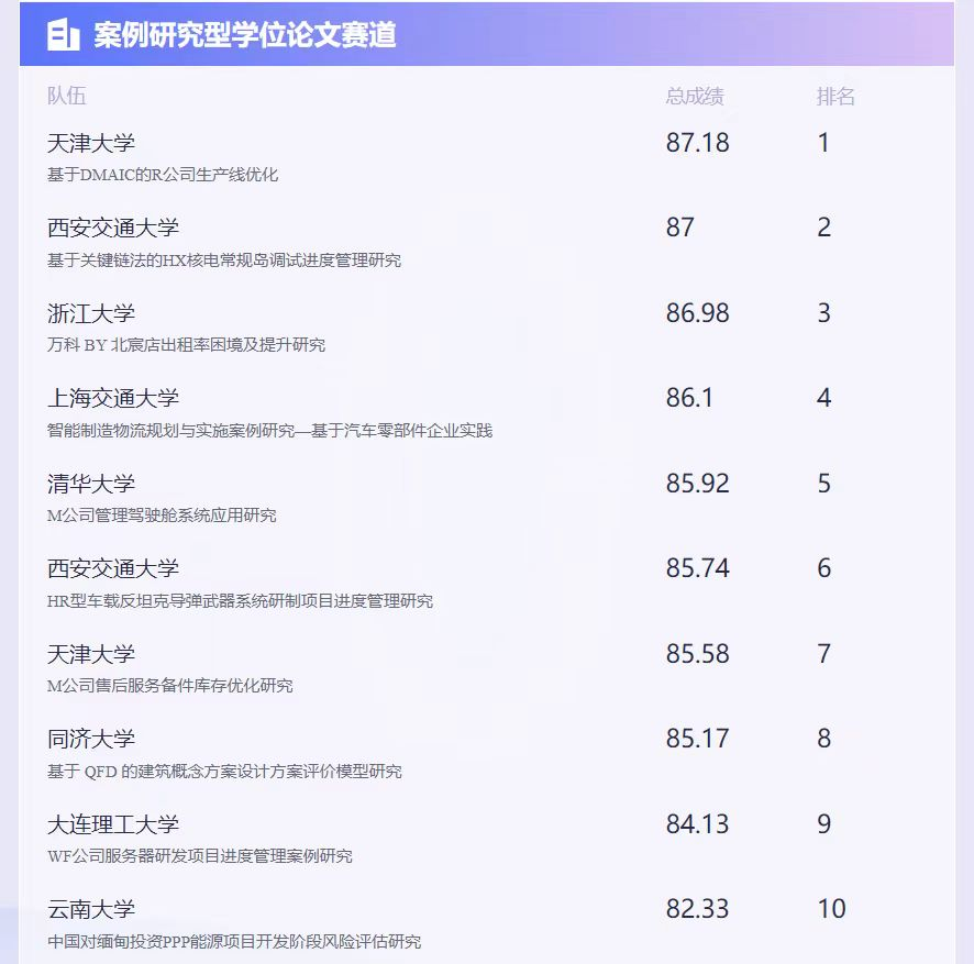 MEM项目共有3支研究生队伍顺利入围全国总决赛。由赵小松副教授指导,张悦撰写的案例《基于DMAIC的R公司生产线优化》以总分第一获案例研究型学位论文赛道全国一等奖;由张敏教授指导,任永辉撰写的案例《M公司售后服务备件库存优化研究》获全国二等奖;由孟俊娜副教授、林峰巍(企业导师)指导,由孔亭、吴家宣、张秋月、董梓茜、王博组成的天之所兴队撰写的案例《大国经验彰显技术自信-M国M项目投标外线组网技术方案优化研究》获重大工程建设赛道全国二等奖。
