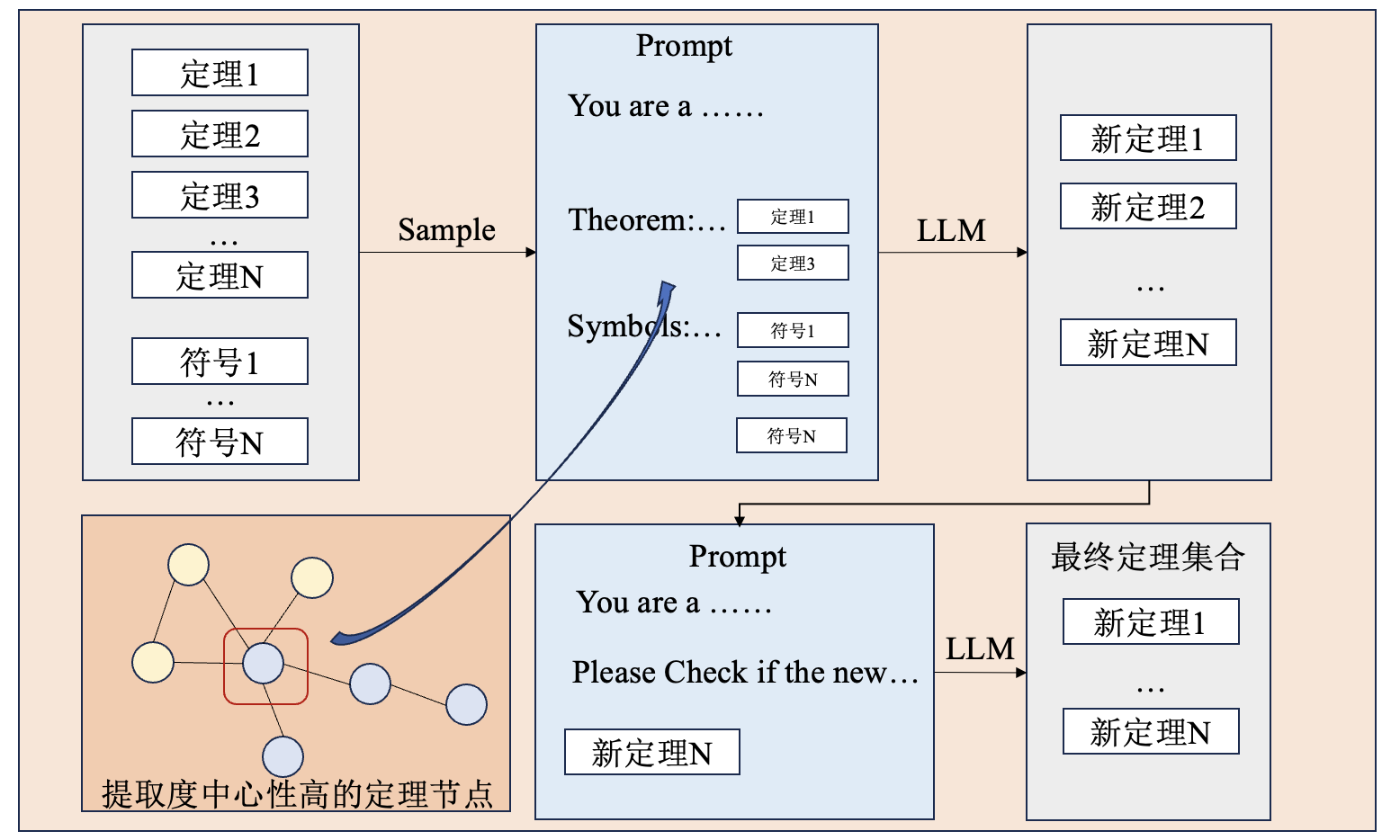 在本次挑战中,本团队使用了GPT-3.5作为推理模型。由于该任务没有明确的标签,因此无法在本地直接测试模型效果。为此,团队首先仔细设计Prompt,比较不同模版的Prompt,在云端运行后,得到效果最好的Prompt。在Prompt中输入随机抽取的15个定理(经灵敏度分析检验)作为推理定理集合,以尽可能提高模型输出的规范性。接下来,本团队在云端多次运行模型,根据云端结果,得到一些效果优异的新定理,将其加入新定理集合中。随后,在本地构建一个定理推导图,每一个节点表示一个定理,并计算每个节点的度中心性并进行排序,将度最高的几个定理加入到高重复性定理集合中。之后,本团队在云端再次运行模型,将这些高重复性的定理输入Prompt,以增强推理效果。通过并行处理的方法,在短时间内生成大量定理,并设置定理验证模块,以提高模型生成定理的通过率。