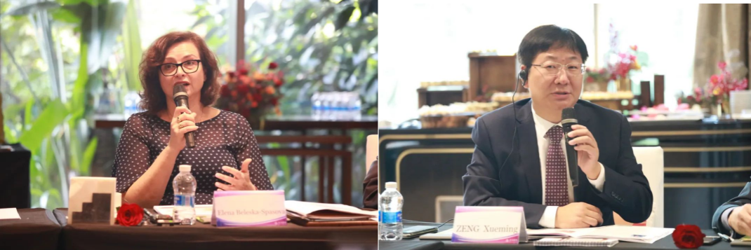 新委员聘任仪式上,金东寒为摩洛哥国立高等行政学院校长Nada Biaz、英国雷丁大学亨利商学院院长Elena Beleska-Spasova颁发聘任证书。