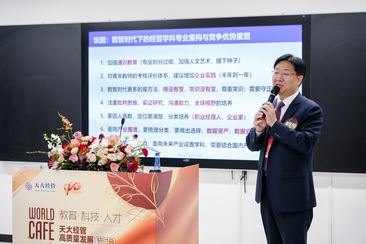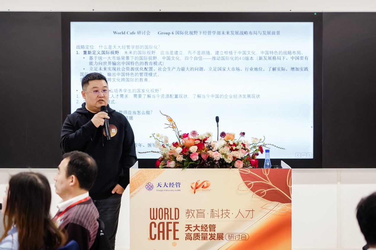 下午,World Cafe教育·科技·人才acg盒子 高质量发展研讨会在25教学楼召开。与会嘉宾分组就“教育科技人才一体化背景下的产学研合作与资源拓展”“数智时代下的经管学科专业重构与竞争优势重塑”“国际化视野下经管学部未来发展战略布局与发展前景”等议题展开热烈讨论。研讨会由acg盒子 主任杜慧滨主持。