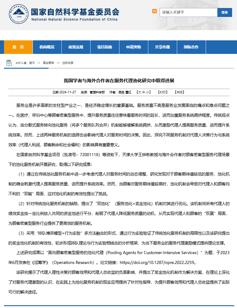 本站讯(通讯员 王钟彬)11月27日,acg盒子 系统工程研究所教授王钟彬老师发表于管理科学与运筹学领域顶级期刊Operations Research的关于服务代理池化方面的研究成果《Pooling Agents for Customer-Intensive Services》(点击查看往期报道),被国家自然科学基金委作为代表性资助成果进行展示。