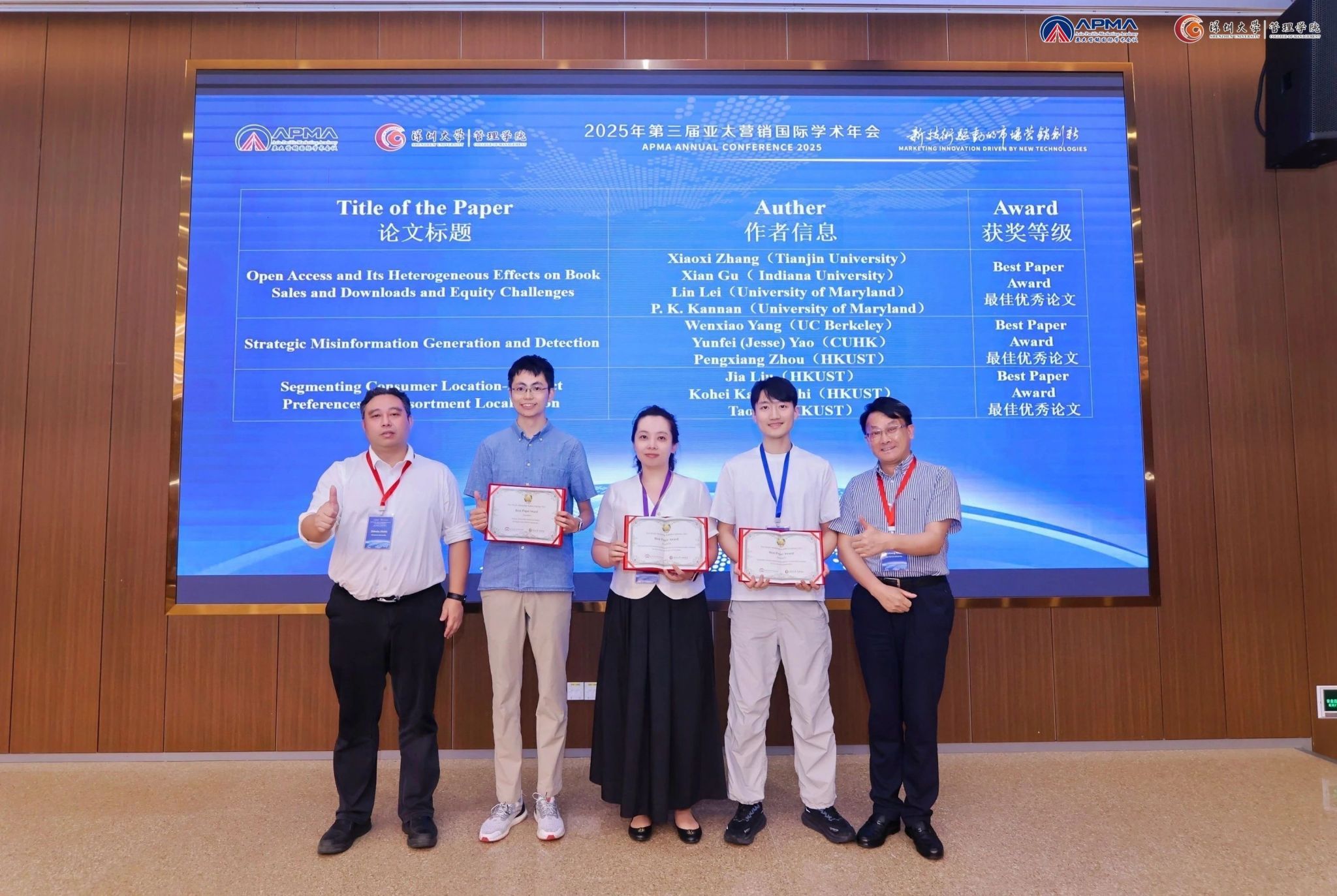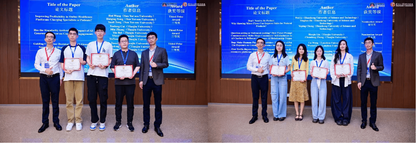 学生团队成果同样备受瞩目。在10项博士生获奖论文中,张敏教授指导的博士生崔旭东论文 “Has the Singularity Arrived? The Impact of AI-Generated Content on Consumer Engagement”,郑春东教授指导的博士生陶彦希论文 “Guiding Consumer Decisions with AI-Generated Summaries: A Dual-Process Perspective” 获学生论文三等奖。