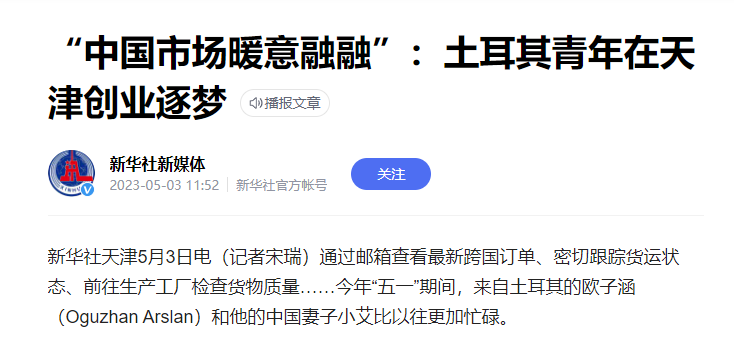 不仅如此,欧子涵还在这里邂逅了爱情,结识了小艾这位美丽的本地姑娘,成了地道的“中国女婿”。妻子小艾很支持欧子涵的创业计划,俩人一拍即合,共同创业。 “希望有一天我能拥有自己的商业品牌,并将我的业务从中国扩展到土耳其。”这位土耳其年轻人对未来充满信心。
