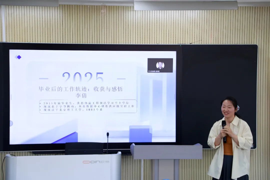 2017级校友武凯(现就职于京东物流,负责快递网络分拣中心的运营规划工作,现任运营计划高级经理)以“快递中小件物流网络模式及发展趋势”为题,解析行业核心运作逻辑与个人成长路径。