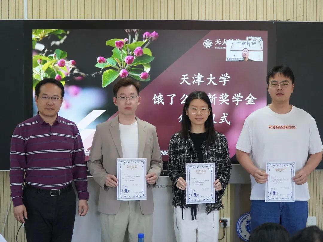 毛照昉、刘钰、李文强为获得“饿了么创新奖学金的同学”颁发证书。