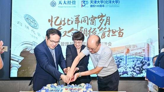 在温馨的乐曲中,学部党委书记毛照昉、学部主任杜慧滨与EMBA校友会会长王友斌共同切开了这份象征团圆与祝福的庆典蛋糕,共庆母校百卅华诞!