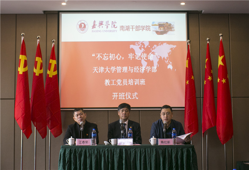 在开班仪式上,嘉兴学院南湖干部学院副院长陈红新发表致辞,对天大学员表示热烈的欢迎。他详细介绍了“红船精神”内涵、嘉兴发展概况、优秀文化传统、南湖干部学院培训情况等内容,并向全体学员提出建议:领会“红船精神”、坚定“四个自信”,始终不忘初心。学部党委书记李连种作开班动员讲话,他对南湖干部学院的精心安排表示感谢,要求学员们要珍惜机会,通过学习提升觉悟,坚定理想信念,践行“两个维护”,把所学精神体现到党的工作中去,体现到教学科研和管理服务工作中去,以饱满的热情和良好的精神状态为学校和学部事业的发展而努力奋斗。仪式最后,南湖干部学院向学员班授予班旗。
