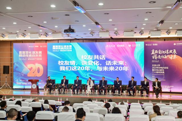 Finally, under the host of Gu Chenjun, student of EMBA Class of 2021,alumni representatives Ma Xin, Li Chuntang, Zhang Yang, Guo Yuechao, Mao Hongcheng, Xu Hehe, Liu Zhigang, and Ge Zhihai, as well as students, engaged in a dialogue with the theme "Alumni friendship, discussing change, talking about the future: our 20 years and the next 20 years". They actively shared their experiences and feelings of studying at TJU, and unanimously believed that they gained rich rewards from their studies at TJU, with significant improvements in their mindset and cognition. They deeply understood the spirit of "Entering TJU, becoming a member of TJU for life" and sincerely wished all alumni to "make great achievements under the name of TJU".
